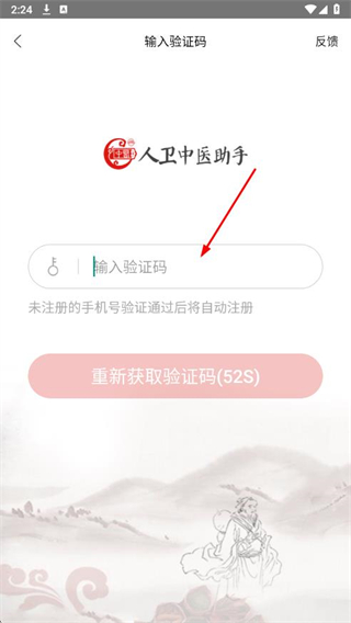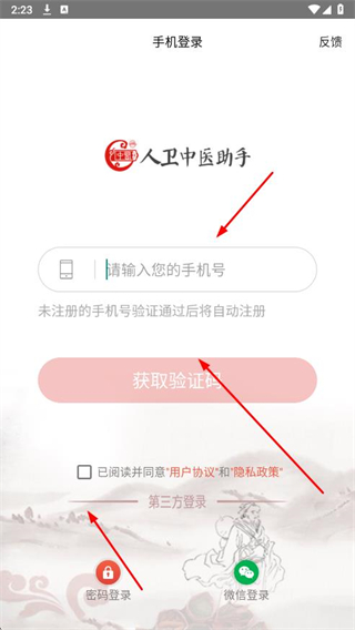 1、打開人衛(wèi)中醫(yī)助手APP,在手機(jī)登錄頁面輸入手機(jī)號(hào),勾選協(xié)議后,點(diǎn)擊獲取驗(yàn)證碼。