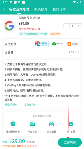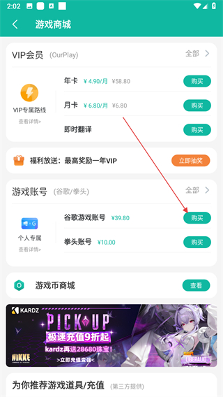 3、在商城頁面,點(diǎn)擊谷歌游戲賬號的購買按鈕。