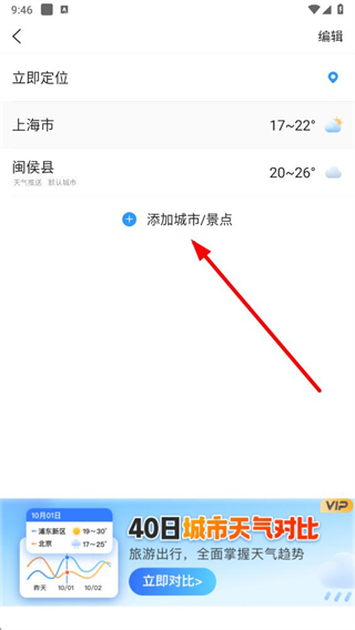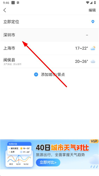 1、在2345天氣王app首頁點(diǎn)擊左上角城市名稱區(qū)域,進(jìn)入城市管理頁面。