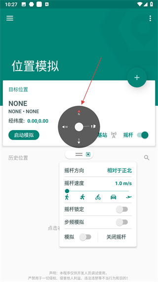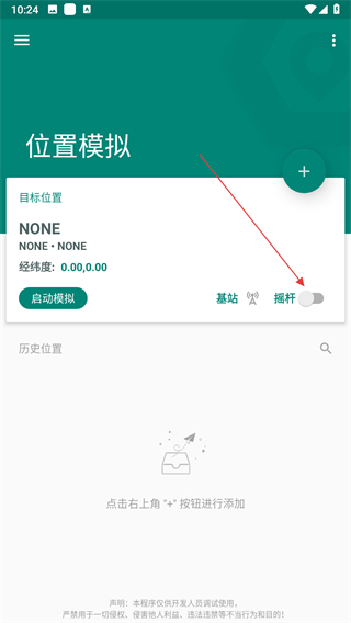 1、打開Fake Location應(yīng)用,在位置模擬頁面點(diǎn)擊搖桿開關(guān)。