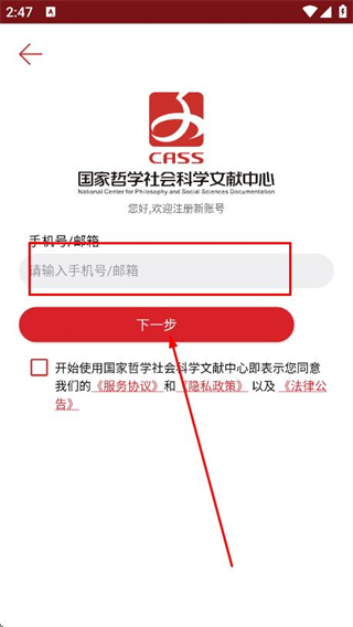 在彈出的注冊(cè)頁(yè)面,輸入手機(jī)號(hào)或郵箱賬號(hào),并同意用戶使用協(xié)議即可完成注冊(cè)。