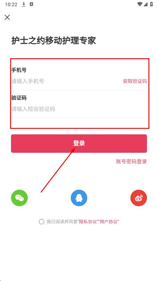 3、在登錄界面,輸入手機(jī)號(hào)、驗(yàn)證碼,勾選隱私協(xié)議、用戶協(xié)議,點(diǎn)擊登錄。
