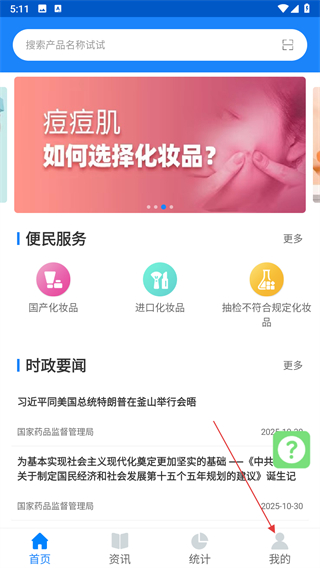 1、打開化妝品監(jiān)管app,點(diǎn)擊右下角我的。
