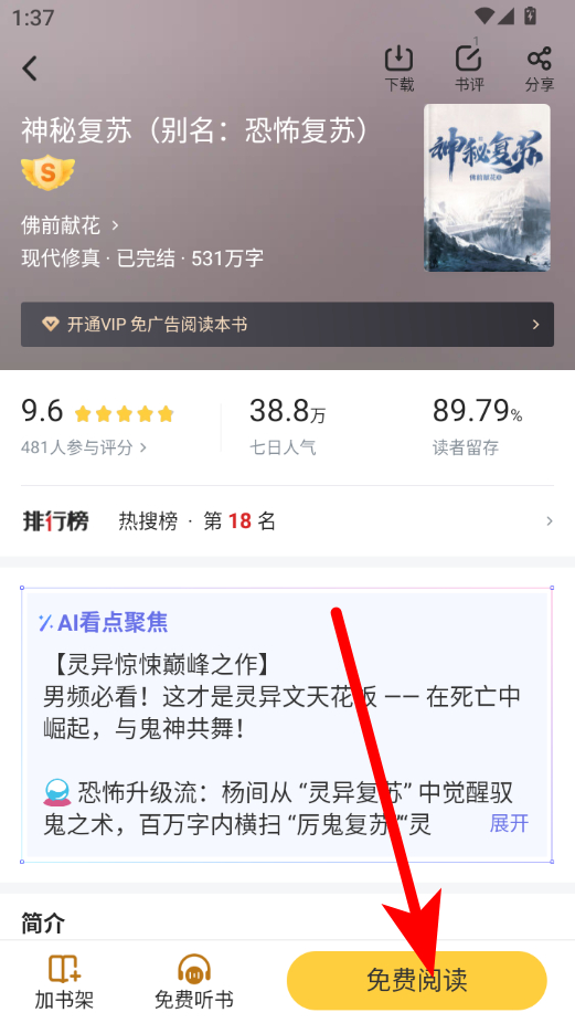 2、在小說書籍詳情頁點(diǎn)擊免費(fèi)閱讀,進(jìn)入閱讀界面。