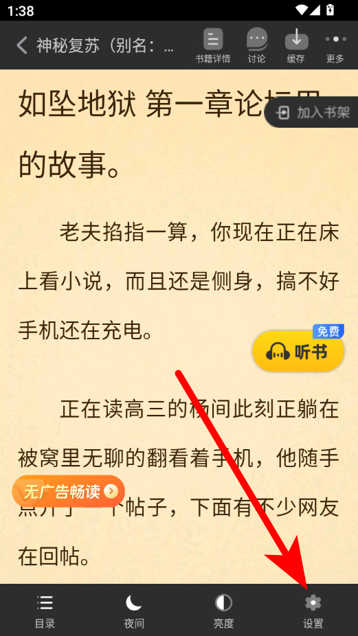 2、在閱讀界面中,點(diǎn)擊屏幕下方的設(shè)置圖標(biāo),進(jìn)入閱讀設(shè)置頁面。