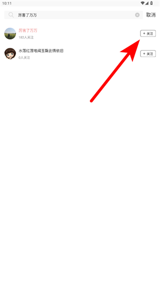 4、搜索結(jié)果出來后,點(diǎn)擊用戶右側(cè)的關(guān)注按鈕,即可完成對(duì)該用戶的關(guān)注。