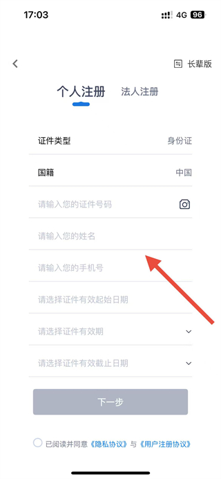 4、在注冊(cè)頁(yè)面中,依次在輸入框填入信息,勾選同意后,點(diǎn)擊下一步,完成后續(xù)操作即可注冊(cè)賬號(hào)。