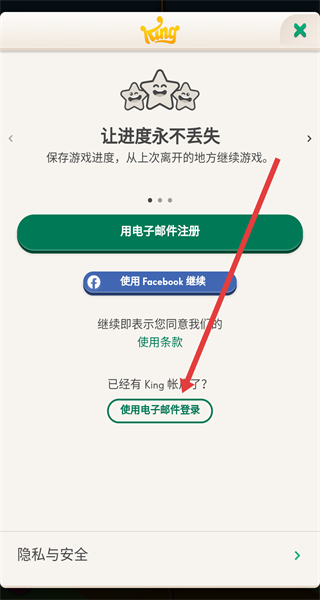 3、在賬號(hào)登錄引導(dǎo)頁(yè)面點(diǎn)擊“使用電子郵件登錄”,進(jìn)入King賬戶登錄界面。