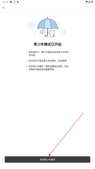 3、進(jìn)入青少年模式的頁(yè)面內(nèi),目前處于開(kāi)啟的狀態(tài),點(diǎn)擊下方關(guān)閉。