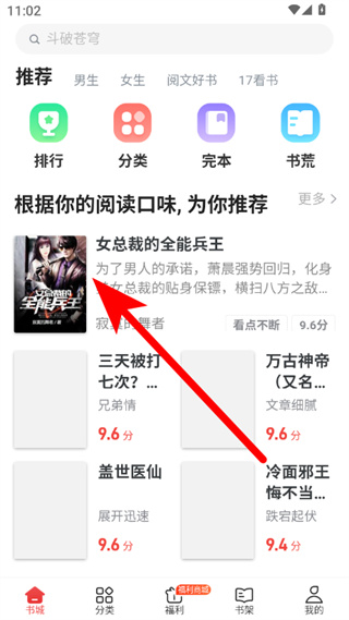 1、在追書神器書城頁面,點(diǎn)擊感興趣的小說,進(jìn)入小說詳情界面。