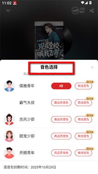 4、在音色選擇界面,選擇儒雅青年、霸氣大叔等音色,即可完成聽書聲音修改。