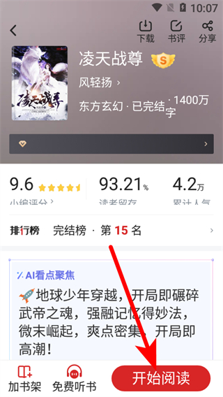 2、在小說詳情界面,點(diǎn)擊開始閱讀,進(jìn)入小說閱讀頁面。