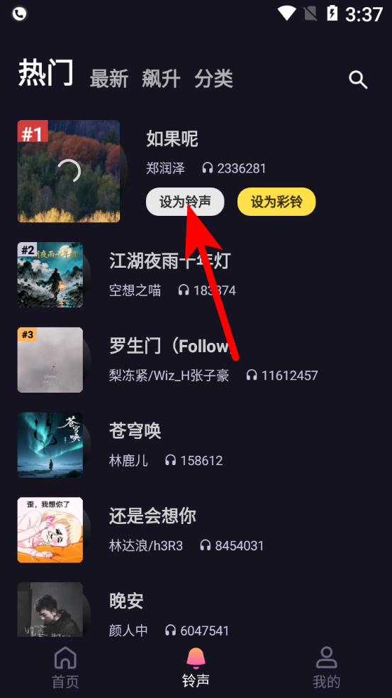 2、在彈出的操作選項(xiàng)中,點(diǎn)擊設(shè)為鈴聲按鈕,觸發(fā)權(quán)限提示彈窗。