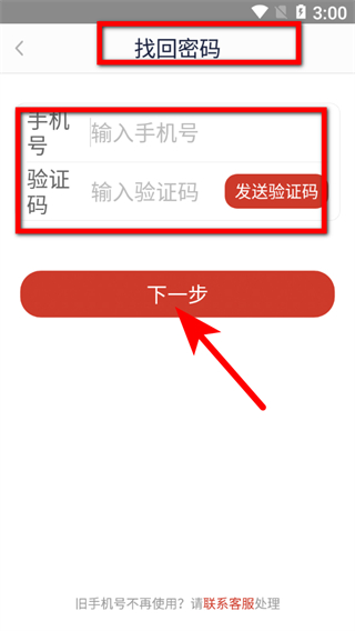 4、在找回密碼頁面,輸入手機號和驗證碼,點擊下一步按鈕,即可按照提示找回密碼。