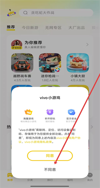 1、在打開vivo小游戲App后,由于不是vivo手機,點擊彈窗中的不同意按鈕,進入使用。