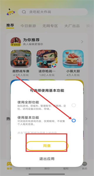 2、在選擇功能頁面中,點擊選擇使用基本功能后,點擊同意按鈕,開始使用。