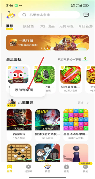 3、在進入到首頁中,可以點擊愛玩的游戲進行長按添加。