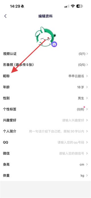 3、在編輯資料頁(yè)面,點(diǎn)擊昵稱選項(xiàng)。