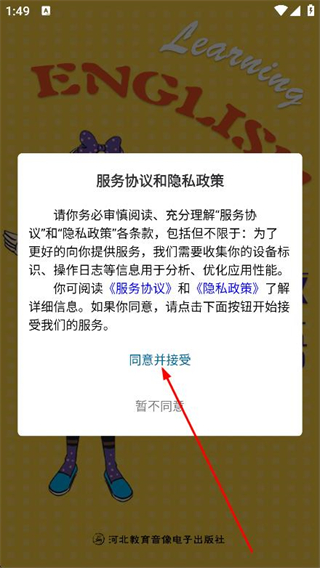 1、打開冀教學(xué)英語,在彈出的窗口中,點(diǎn)擊同意并接受。