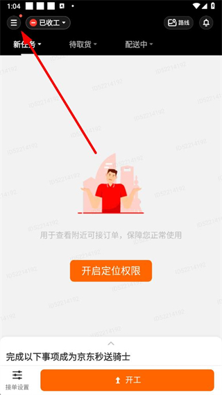 1、在京東秒送騎士app頁面點擊左上角菜單按鈕,展開功能列表。