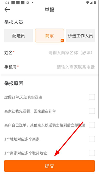 4、在舉報頁面選擇商家舉報人員類型,填寫詳細(xì)信息,選擇舉報原因后點擊提交按鈕。