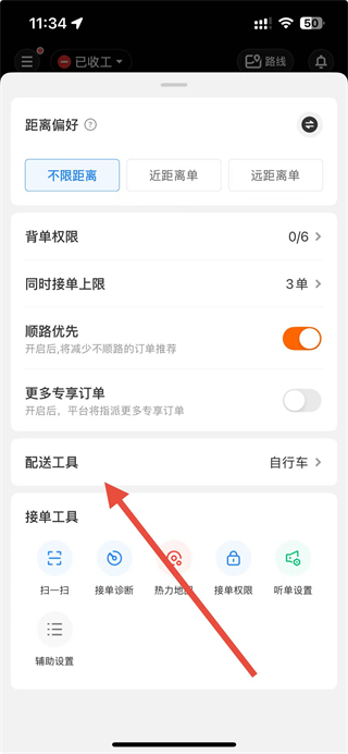 2、在接單設(shè)置頁面點擊配送工具選項,進(jìn)入選擇交通工具頁面。