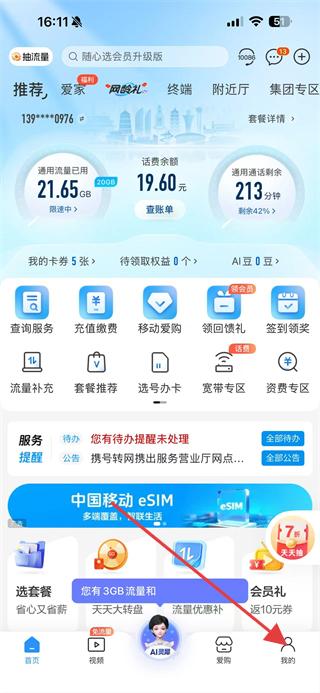 1、打開(kāi)中國(guó)移動(dòng)甘肅APP,點(diǎn)擊右下角我的,進(jìn)入個(gè)人頁(yè)面。
