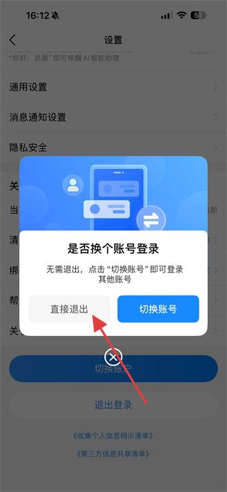 4、在確認(rèn)框中點(diǎn)擊直接退出,完成賬號(hào)退出登錄。