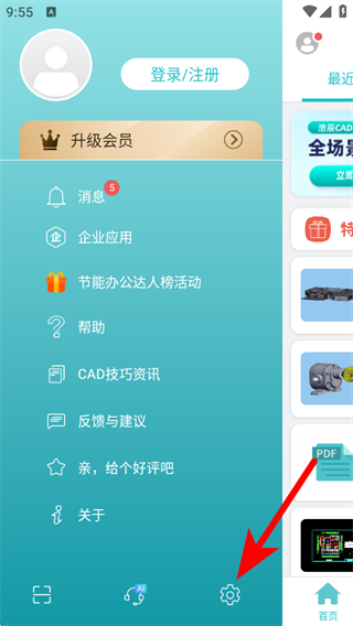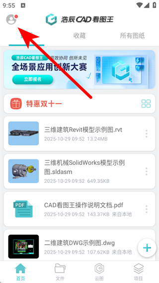 1、打開浩辰CAD看圖王APP,點(diǎn)擊左上角的頭像,展開個(gè)人功能菜單。