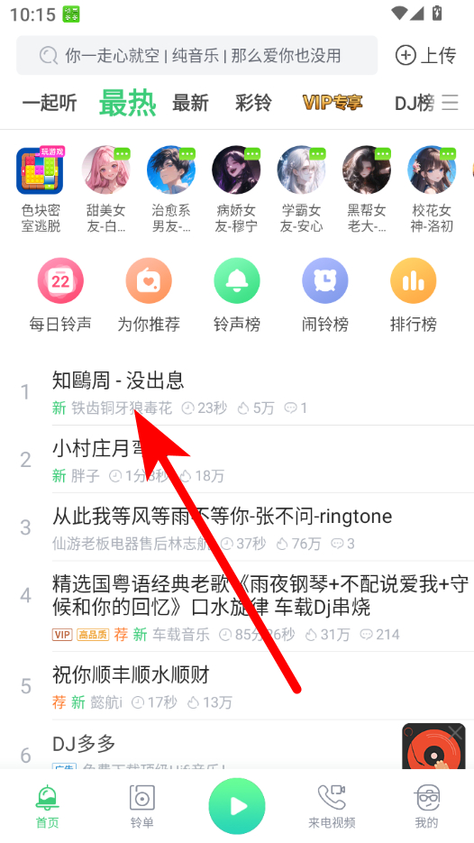 2、隨后,大家進(jìn)入首頁可以看到海量的鈴聲,可隨機(jī)挑選自己感興趣的音樂并點(diǎn)擊;
