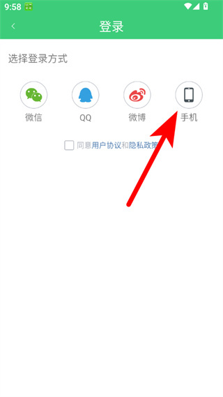 3、在登錄頁面,點(diǎn)擊手機(jī)選項,進(jìn)入手機(jī)號登錄界面。