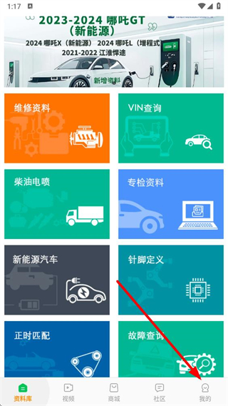 1、在修車神汽app資料庫頁面點(diǎn)擊我的選項(xiàng),進(jìn)入個(gè)人頁面。