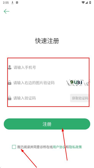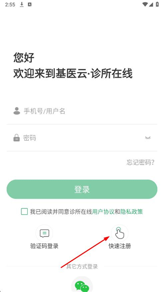 1、打開診所在線APP,在登錄頁(yè)面點(diǎn)擊快速注冊(cè)。