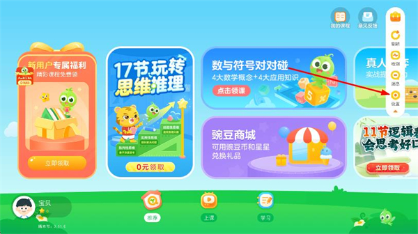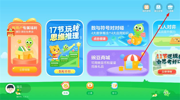 1、打開豌豆素質(zhì)app,點擊右上角工具箱圖標。