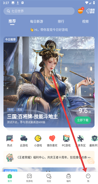 1、在進入到4399游戲盒首頁后,可以點擊底部我按鈕,進入我的主頁。