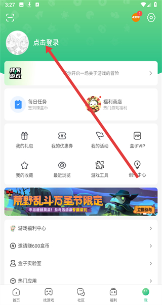 1、打開4399游戲盒進入我頁面,點擊綠色區(qū)域內(nèi)主頁進入個人主頁。