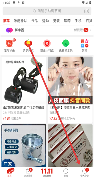1、在拼多多主界面點擊右下角“個人中心”,進(jìn)入個人中心頁面。