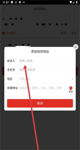 4、在表單中依次填寫收貨人姓名、手機(jī)號碼、地區(qū)、詳細(xì)地址等信息,點擊“保存”,完成收貨地址添加。