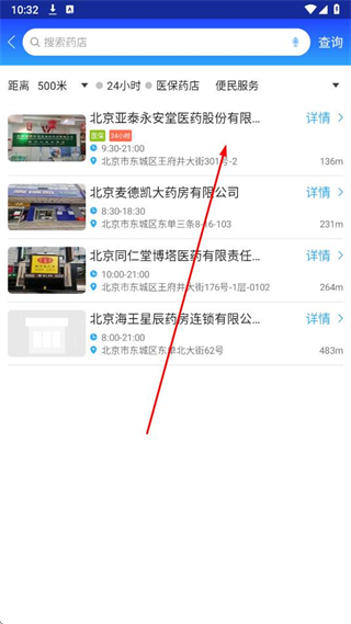 2、在附近藥店列表中,選擇目標(biāo)藥店,點(diǎn)擊進(jìn)入藥店詳情頁面。