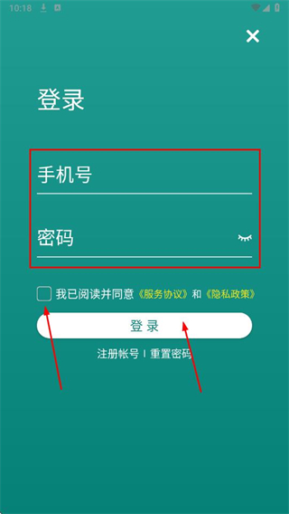 3、輸入手機(jī)號(hào)和密碼,勾選服務(wù)協(xié)議和隱私政策,點(diǎn)擊登錄。