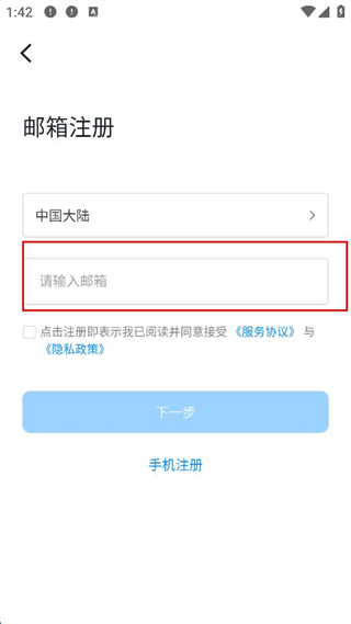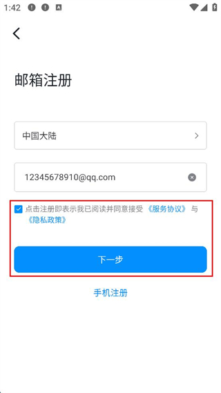 3、勾選點(diǎn)擊注冊(cè)即表示已閱讀并同意接受服務(wù)協(xié)議與隱私政策,點(diǎn)擊下一步。