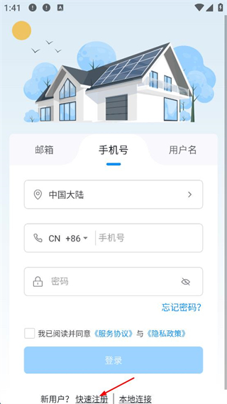 1、打開(kāi)家居類(lèi)APP,點(diǎn)擊登錄頁(yè)面的快速注冊(cè)。