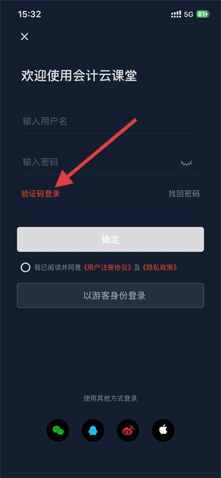 3、在登錄頁面,找到并點(diǎn)擊左下方的驗(yàn)證碼登錄選項(xiàng)。