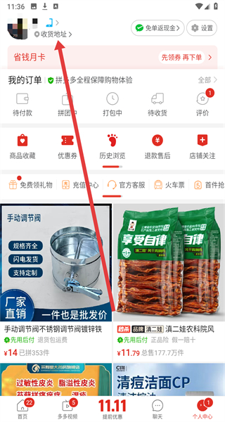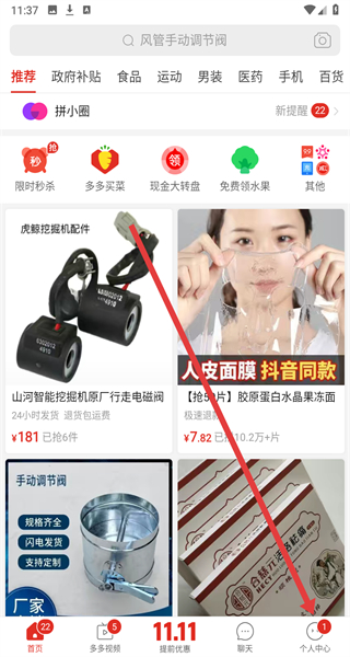 1、在進(jìn)入到拼多多首頁(yè)中,可以點(diǎn)擊個(gè)人中心按鈕,進(jìn)入個(gè)人中心頁(yè)面。