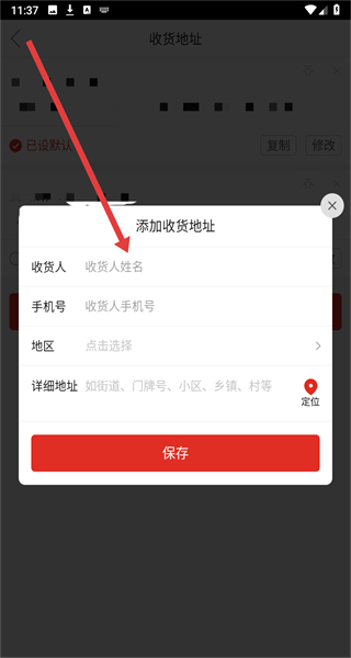 4、在添加收貨地址彈窗中依次輸入對(duì)應(yīng)信息后,點(diǎn)擊保存即可完成添加。