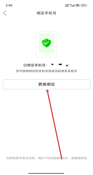2、在點(diǎn)擊綁定手機(jī)號(hào)頁(yè)面,可以點(diǎn)擊更換綁定按鈕,進(jìn)行更換操作。