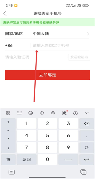 4、在進(jìn)入到下一步后,點(diǎn)擊輸入框填寫新手機(jī)號(hào)并輸入對(duì)應(yīng)的驗(yàn)證碼,即可完成更換綁定操作。