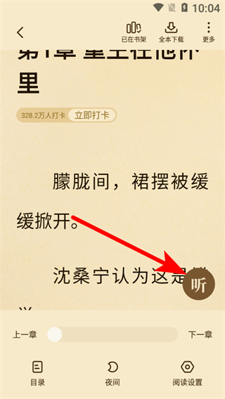 2、在小說閱讀界面,點擊聽按鈕,進入聽書界面。