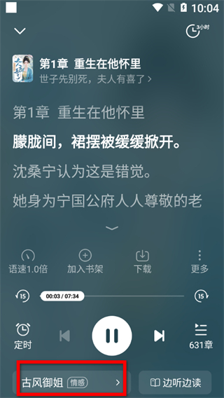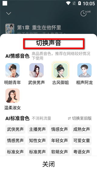 3、在聽書界面,點擊古風(fēng)御姐選項,彈出切換聲音列表。