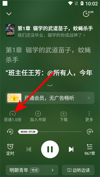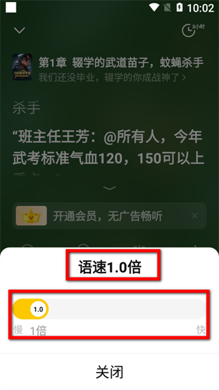 3、在小說收聽界面,點(diǎn)擊語速1.0倍選項(xiàng),彈出語速調(diào)節(jié)框。